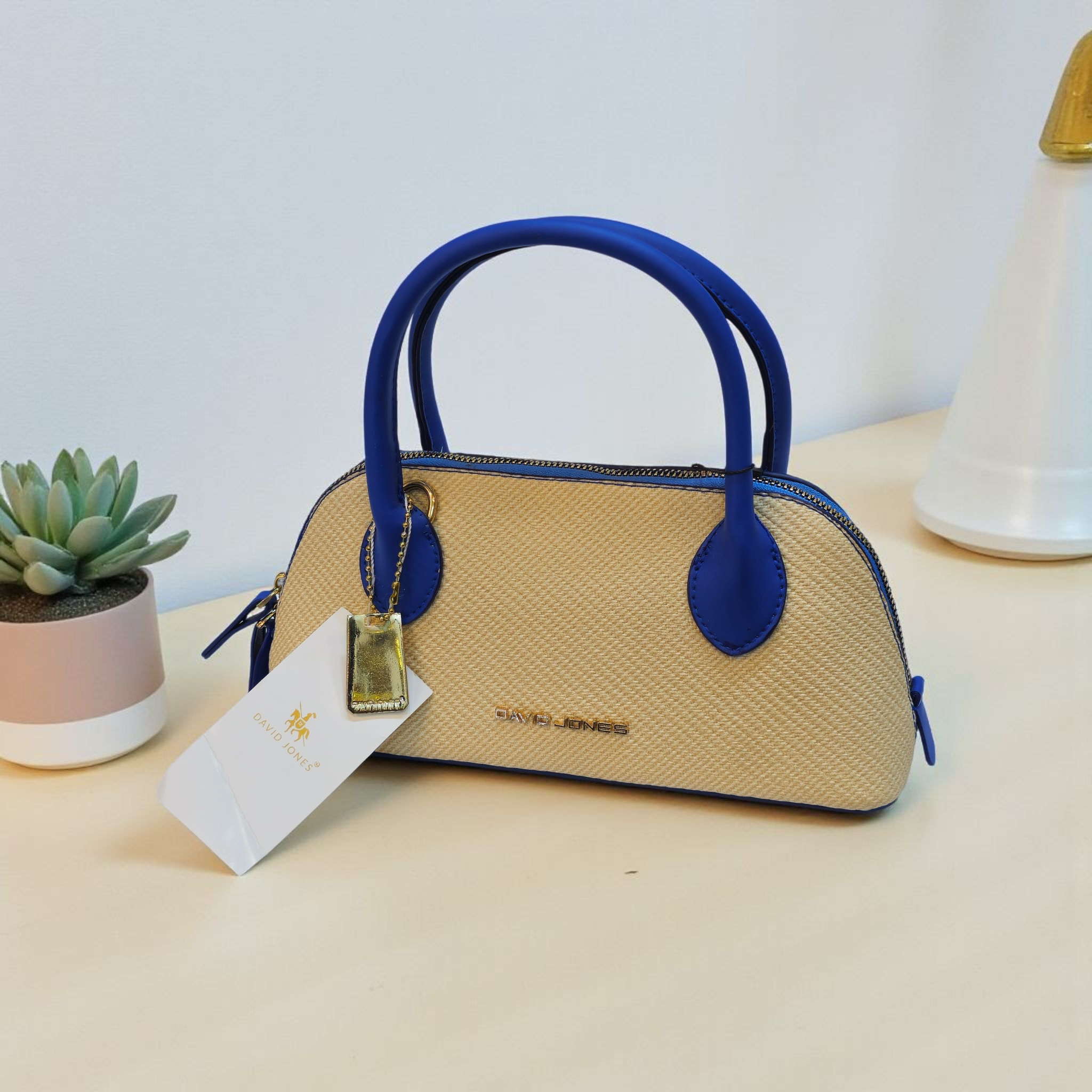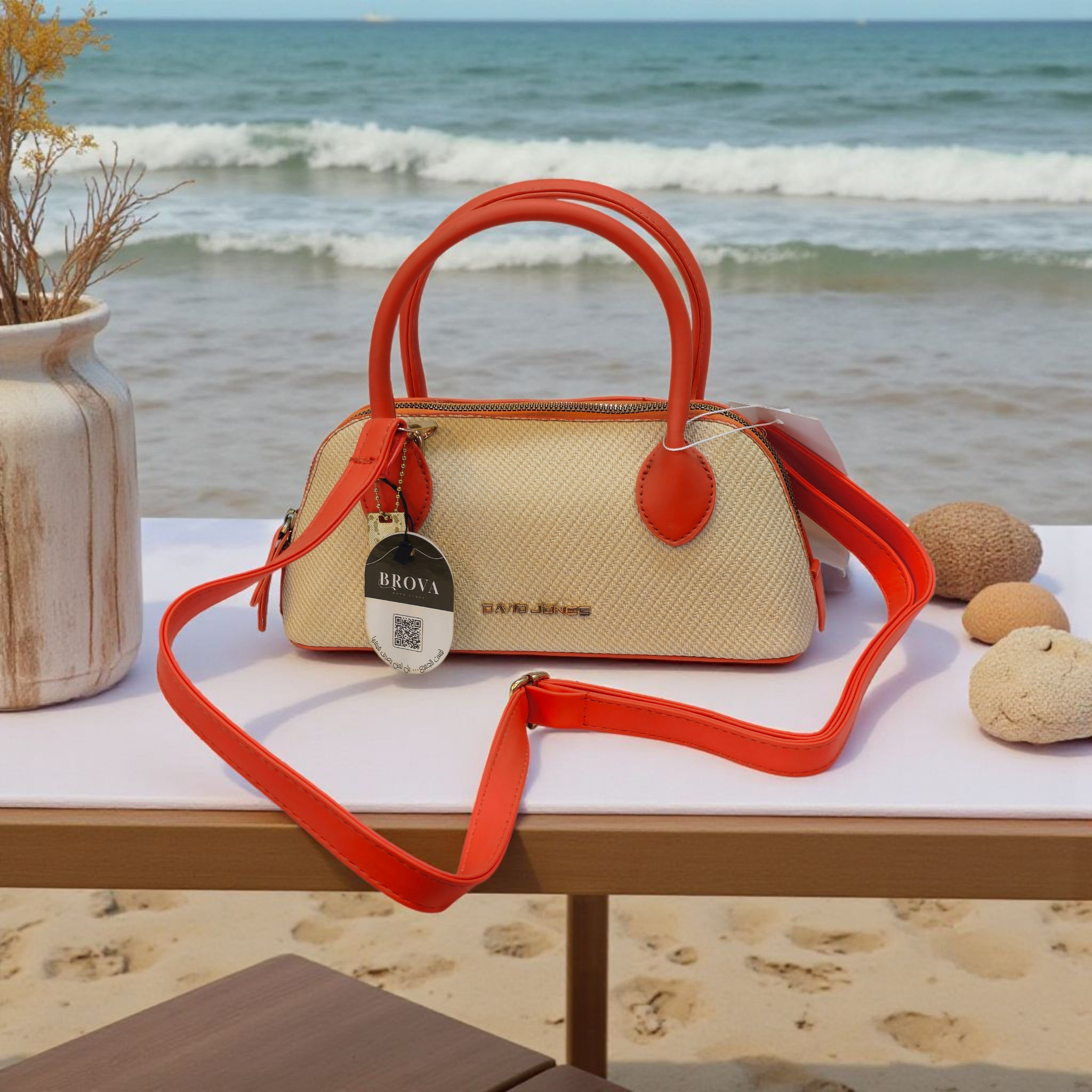 • تصميم جذاب: يتميز الهيكل الرئيسي بتصميم منسوج (أو قماشي/خامة القش الصناعي) يضفي عليها طابعاً صيفياً منعشاً وأنيقاً، مع تفاصيل جلدية ناعمة ذات لون متباين (مثل البرتقالي، الأزرق الملكي، أو الأسود) تبرز جمال التصميم.