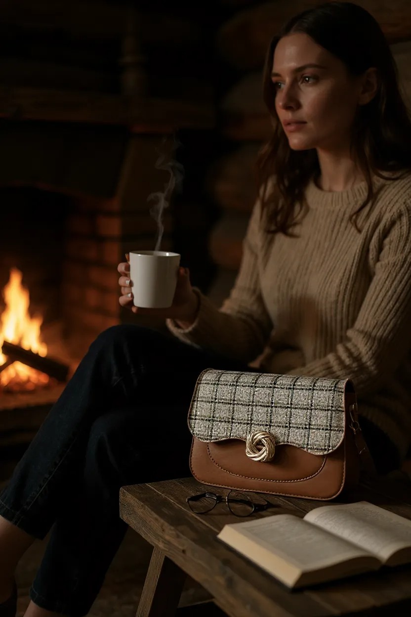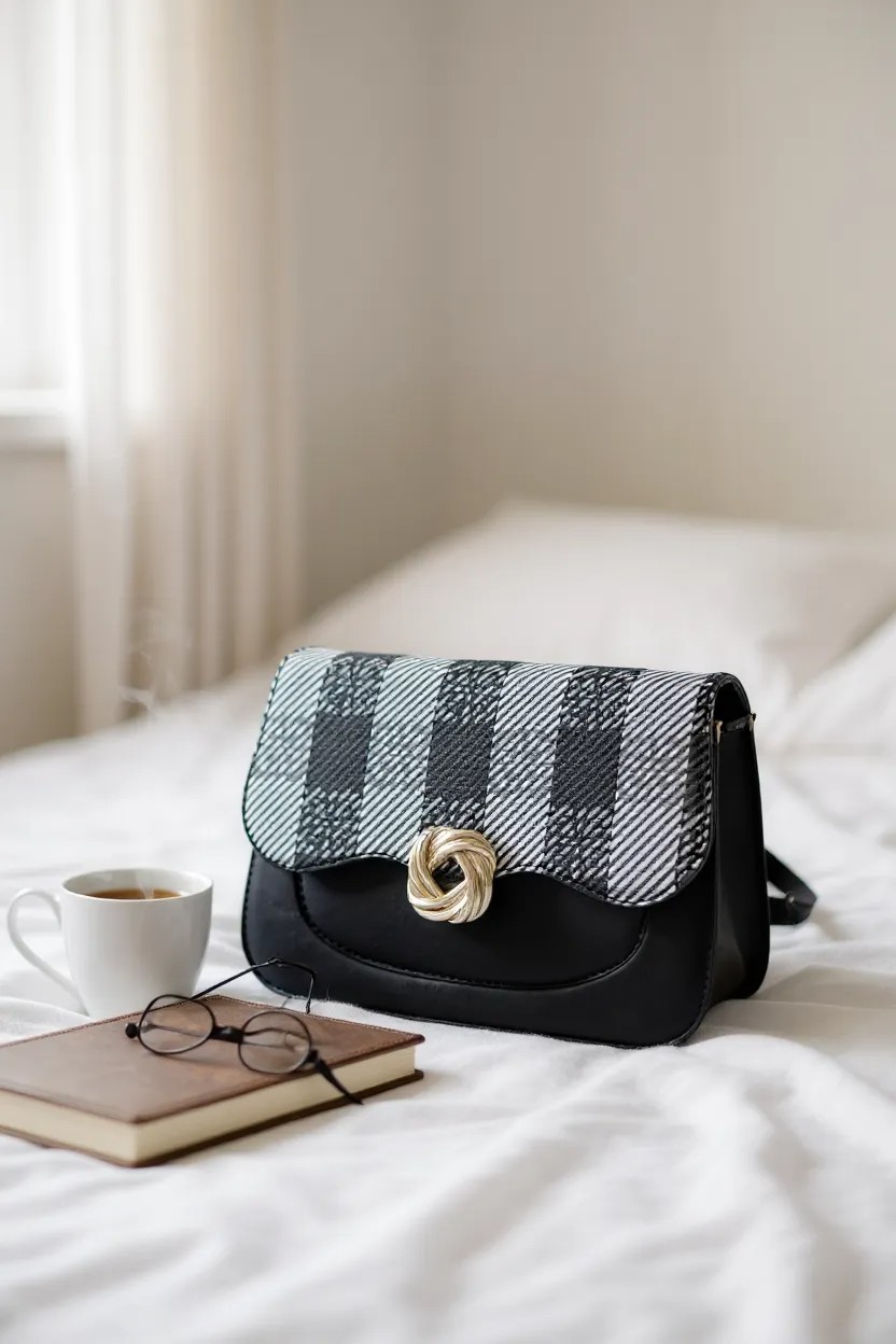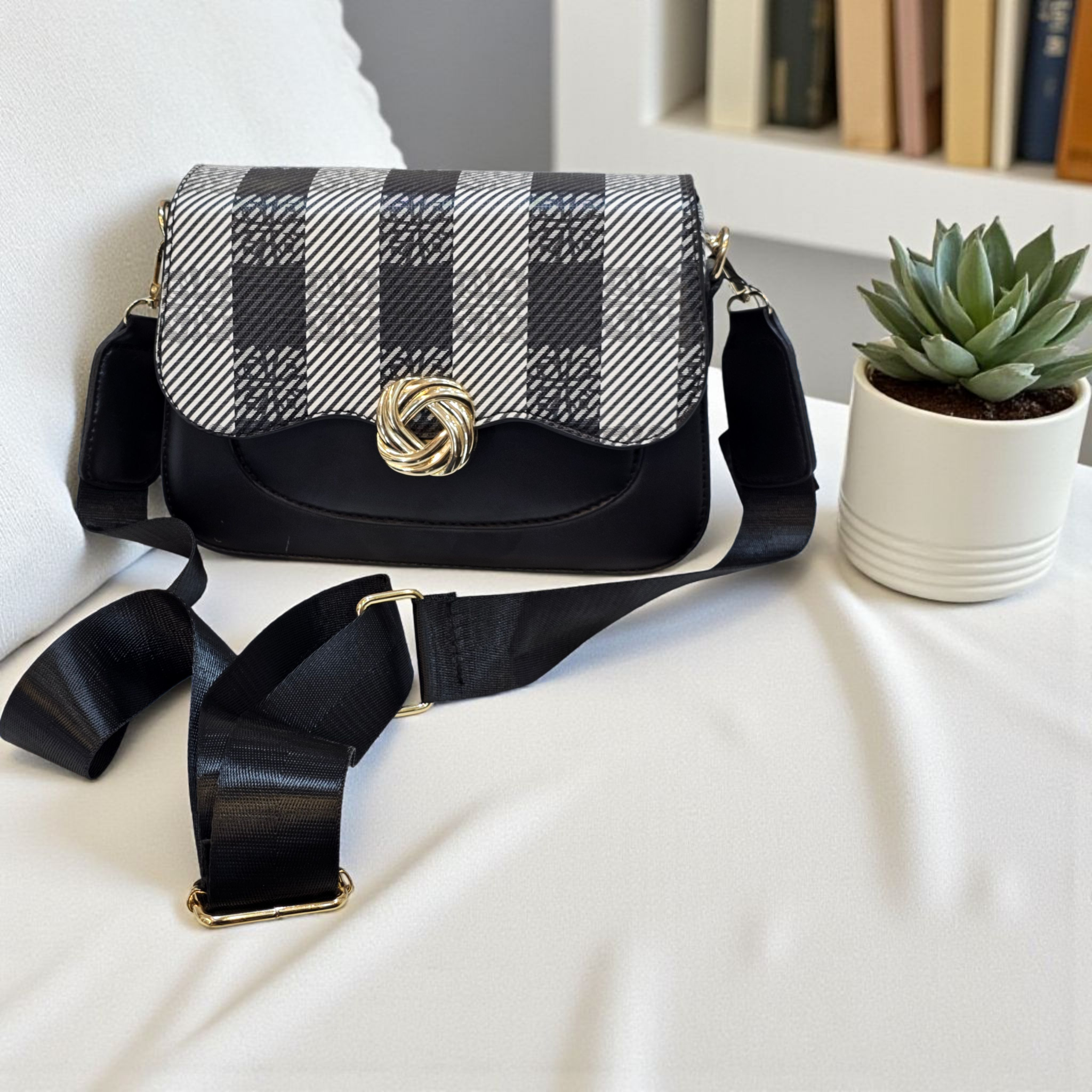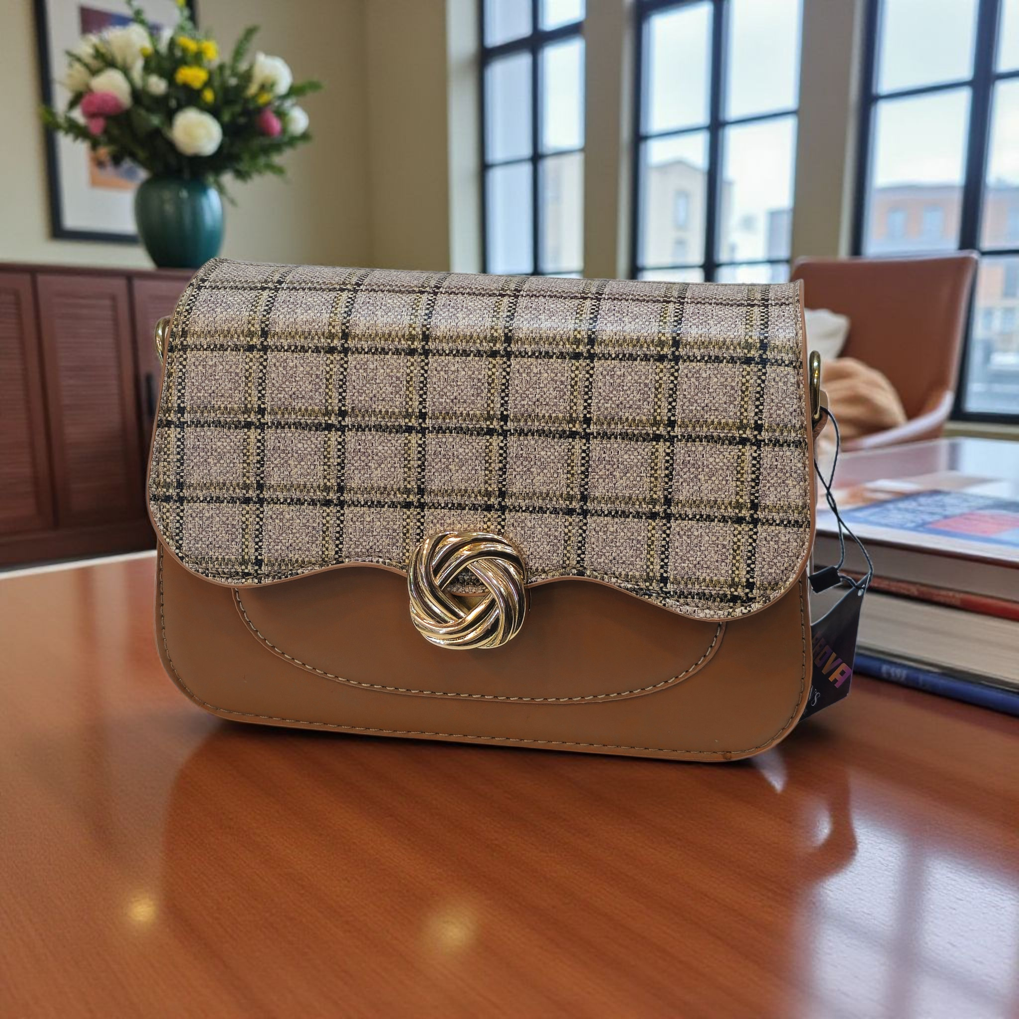 - تصميم مزدوج الخامات: يتميز الغطاء القلاب (الفلاّب) بنقشة قماشية مميزة (كاروهات أو تارتان) تتناغم بشكل رائع مع الجسم الجلدي السادة للشنطة.